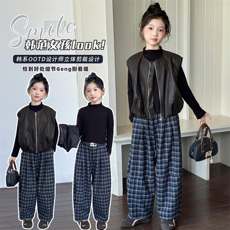 悠*悦下载视频“皮马甲打底衫格子裤三件套”
